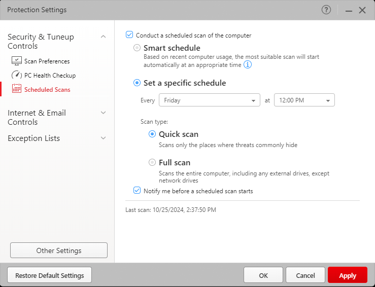 If you select the Gear icon from the main menu, there is a Scheduled Scans section under Security & Tuneup Controls. Smart schedule is the default option, but if you select “Set a specific schedule,” you can change the frequency and time frames where scans are run; as well as what type of scan is initiated, either Quick or Full scan.