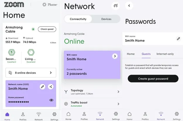 With Zoom Enhanced Wi-Fi and the Home app, you can look up your Wi-Fi password or add a guest password with ease. Under the Home screen, your home’s primary Wi-Fi password will be available. You can either tap the dots to reveal the password or use the share/copy options to send it directly to a family member’s device.